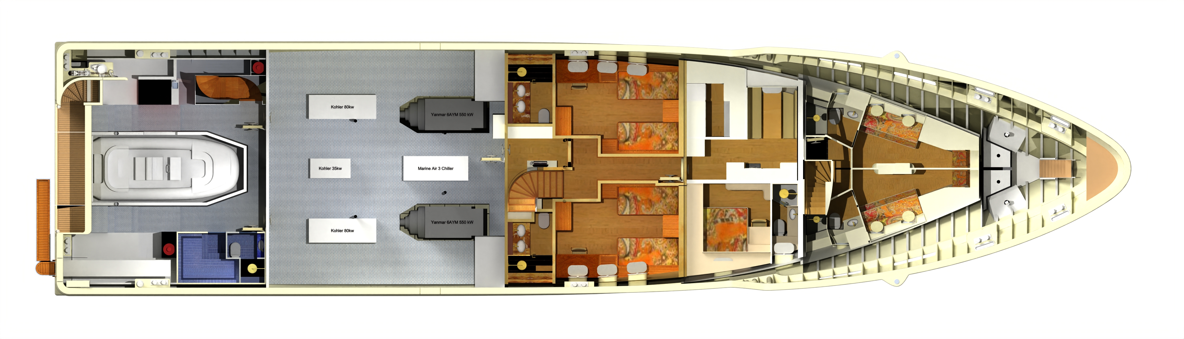 Lower deck with crew area, guest cabins, engine room and lazarette